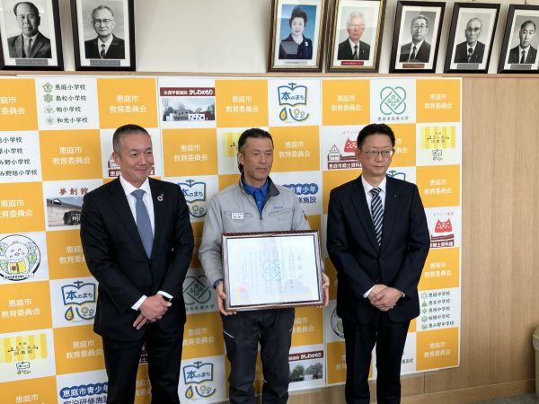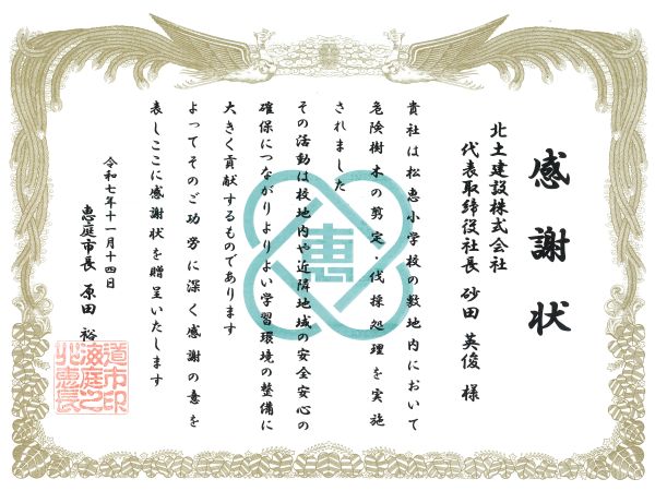 | 恵庭市立松恵小学校敷地内において、危険樹木の伐採と剪定に協力し、恵庭市教育委員会 岩渕隆教育長より感謝状をいただきました。 |