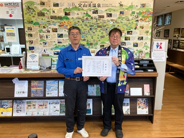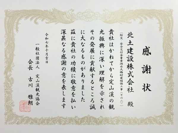 二見吊橋周辺の清掃・整備に協力し、定山渓観光協会古川雅朗会長より感謝状をいただきました。 |