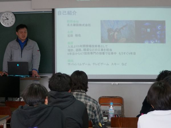 2月27日、札幌建設業協会主催による建設DXに関する出前講座が、札幌工科専門学校において開催されました。講師は土木部DX戦略部の保坂部長と石田主任が努め、環境土木工学科1年生13人を対象に講義を行いました。