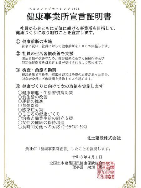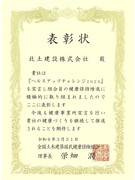 また、「ヘルスアップチャレンジ2025」の宣言に対し、社員の健康保持増進に取り組んだことが評価され、全国土木建築国民健康保健組合より表彰されました。