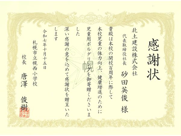 札幌市役所において、令和7年度さっぽろまちづくりスマイル企業表彰の表彰式が執り行われ、秋元克広札幌市長より表彰状が授与されました。
