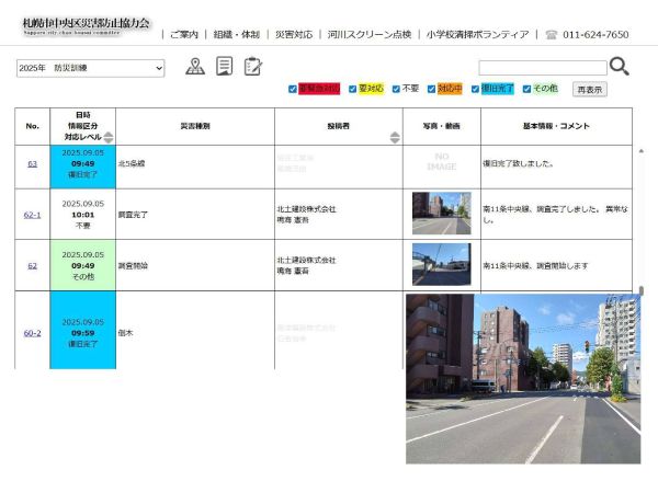 中央区災害防止協力会の一員として、緊急輸送道路被害調査訓練に参加しました。当日は、9時15分に石狩地方中部を震源としたマグニチュード7.3の直下型地震が発生したとの想定で、会員各社が担当路線をパトロールし、中央区災害防止協力会が独自に活用している連絡ツール(防災sNET)を通じて現地から報告しました。