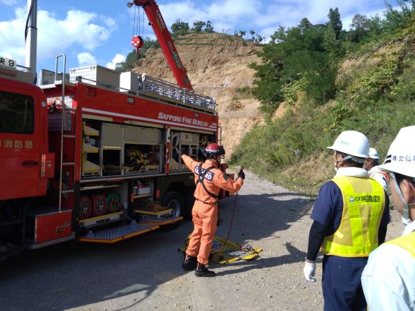 中央区災害防止協力会の一員として、緊急輸送道路被害調査訓練、一時救命処置講習に参加しました。当日は、9時5分に石狩地方中部を震源としたマグニチュード7.3の直下型地震が発生したとの想定で、会員各社が担当路線をパトロールし、中央区災害防止協力会が独自に活用している連絡ツール(防災sNET)を通じて現地から報告しました。調査終了後、国際館パミールにて行われた一時救命処置講習(心肺蘇生法・AEDの取扱い方)に参加しました。