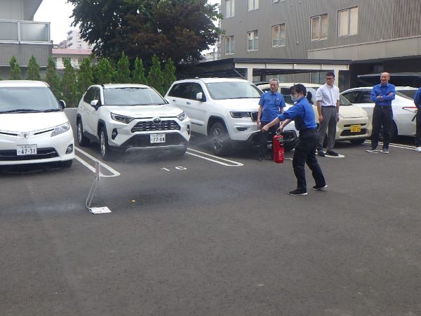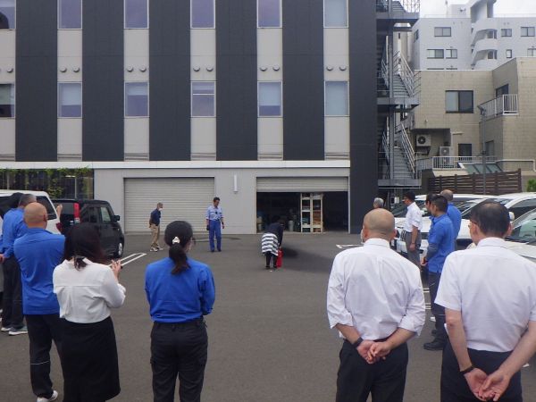 株式会社マキ商会様の協力を得て、避難訓練と水消火器を使用した消火訓練を実施しました。午後2時、本社3階パントリーより出火したと想定。初期消火で鎮火できず、各階担当者による避難の呼び掛け誘導により、避難階段から社員全員が駐車場に避難しました。