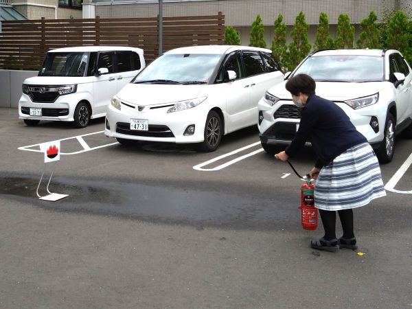 避難場所では訓練用の水消火器を使用した消火訓練を行い、万が一のときに速やかに消火活動が出来るよう取り組みました。