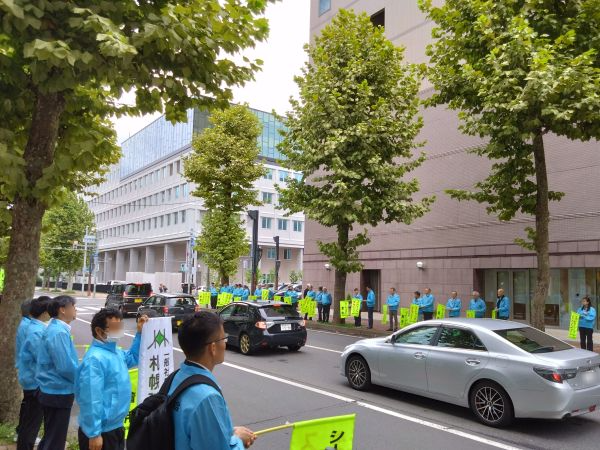 札幌建設業協会会員企業から54社112名が集まり秋の交通安全街頭啓発活動を実施。弊社からは2名が参加し、のぼりや旗を掲げながら道行くドライバーに交通安全を呼びかけました。