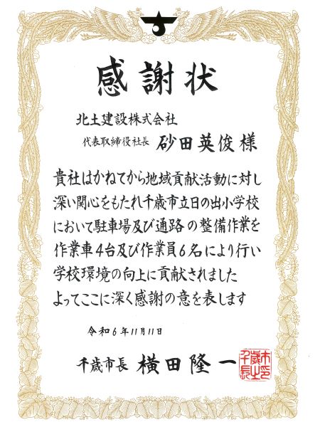 千歳市立千歳第二小学校の職員駐車場の整地、アスファルト補修に協力し、佐々木めぐみ校長より感謝状をいただきました。