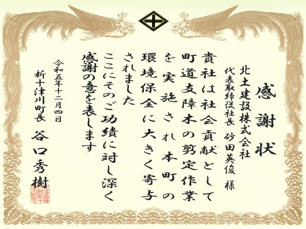 町道里見北7線の支障木剪定作業に協力し、谷口秀樹新十津川町長より感謝状をいただきました。